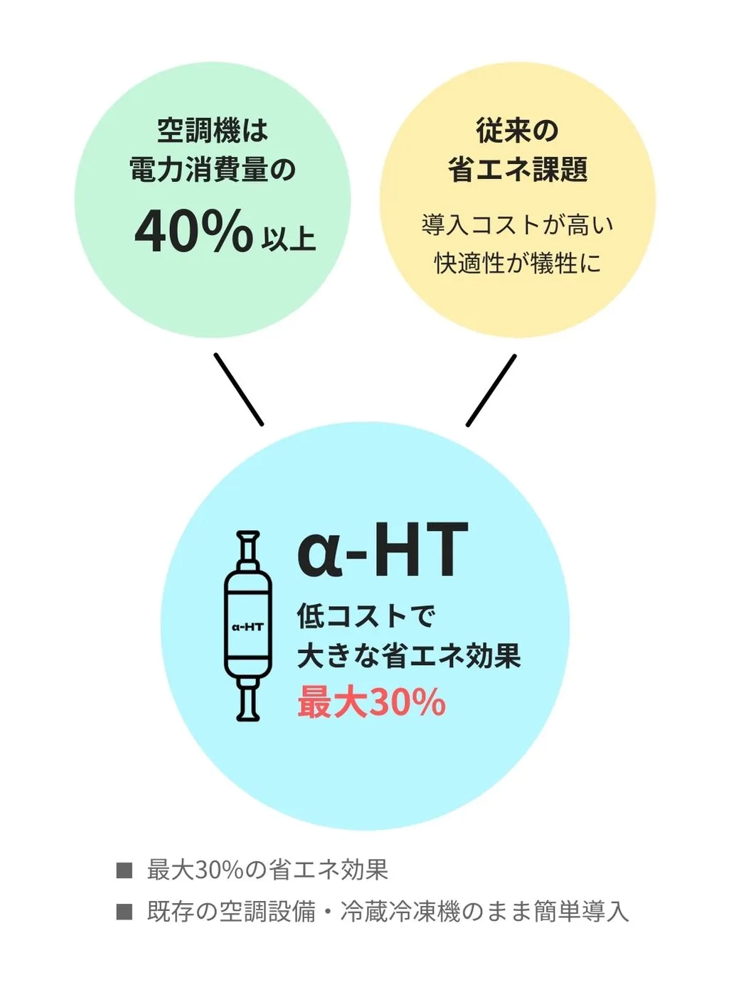 - 「α-HT」を導入すれば、低コストで大きな省エネ効果を実現することが可能です。既存の空調設備や冷蔵冷凍機のまま、本体の改造は行わず、簡単な工事だけで導入可能。しかも、最大30%の省エネ効果が期待できます。